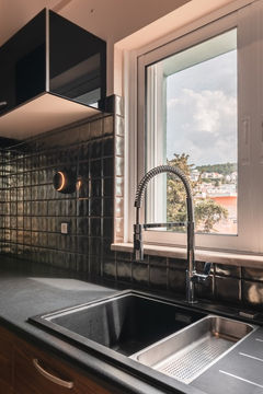 The Alpha Delight Apartment showcases a harmonious blend of natural light, minimalistic design, and striking geometric elements, creating a visually appealing and unique living space. Its architectural approach is complemented by carefully chosen modern furnishings and art pieces, which harmoniously integrate neutral shades of white and teal green, resulting in an aesthetically pleasing and inviting atmosphere.